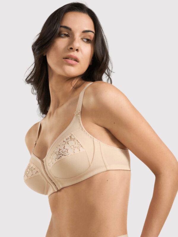 Χωρίς μπανέλα, διακοσμημένο με ελαστική δαντέλα στις cup. Εξοπλισμένο με μπροστινό κούμπωμα για μέγιστη πρακτικότητα και λειτουργικότητα. Cups εσωτερικά επενδυμένα με βαμβάκι, χωρίς ενίσχυση και με ειδική δομή πολλαπλών τμημάτων. Ρυθμιζόμενες ράντες ώμου.