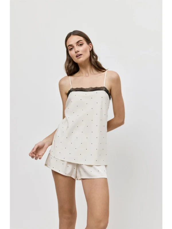 Baby Doll από την νέα συλλογή της Aruelle. Το σετ αποτελείται από ένα αέρινο lingerie top σε εκρού απόχρωση με λεπτά μαύρα πουά, διακοσμημένο με ντελικάτη μαύρη δαντέλα στο ντεκολτέ. Συνοδεύεται από ένα κομψό κοντό σορτσάκι στο ίδιο μοτίβο, σχεδιασμένο για να προσφέρει εξαιρετική εφαρμογή και ελευθερία κινήσεων. Κατασκευασμένο από ποιοτική φυσική σατινέ viscose, το σετ Ada χαρίζει την πολυτελή αίσθηση του μεταξιού πάνω στο δέρμα. Είναι δροσερό, ελαφρύ και αναπνέει, καθιστώντας το ιδανικό για τις ζεστές καλοκαιρινές νύχτες.