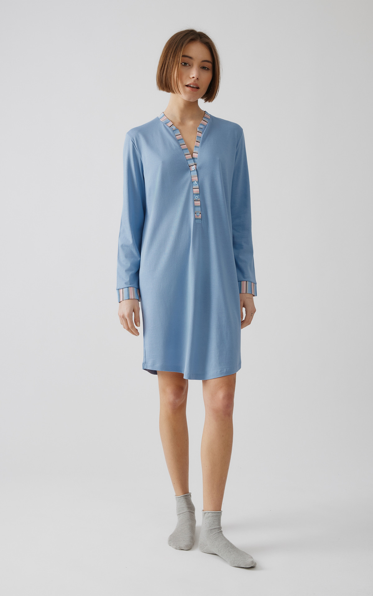 Χειμερινή νυχτικιά από 50% TENCEL™ Modal & 50% βαμβάκι, υψηλής ποιότητας. Η μίξη αυτών των δύο φυσικών ινών προσδίδει ένα εξαιρετικό αποτέλεσμα, ιδανικό για πυζάμες και άνετα ρούχα. Έχει V λαιμόκοψη, με πατιλέτα και κουμπιά και μήκος πάνω από το γόνατο. Αποτελεί ιδανική επιλογή για εγκύους και θηλάζουσες.