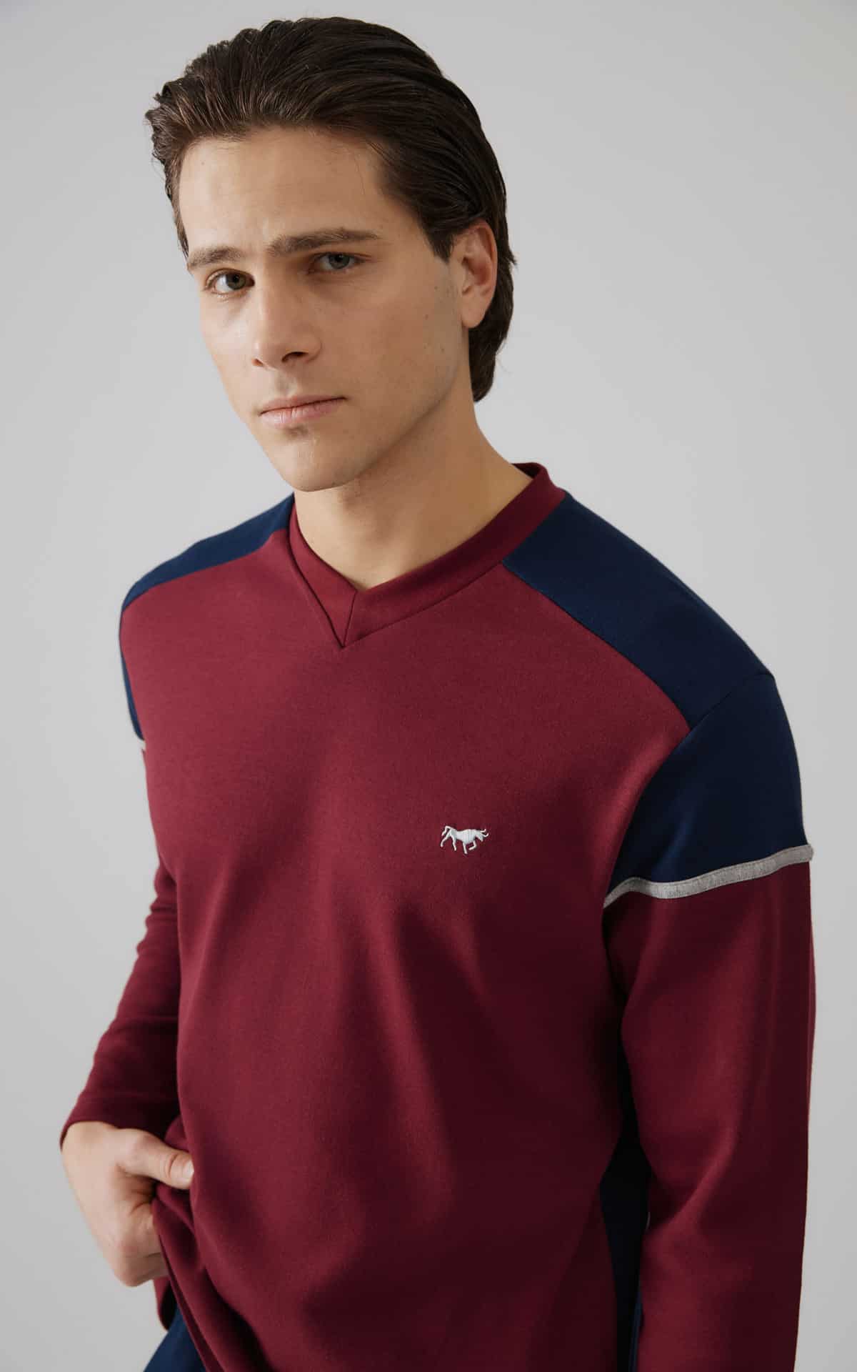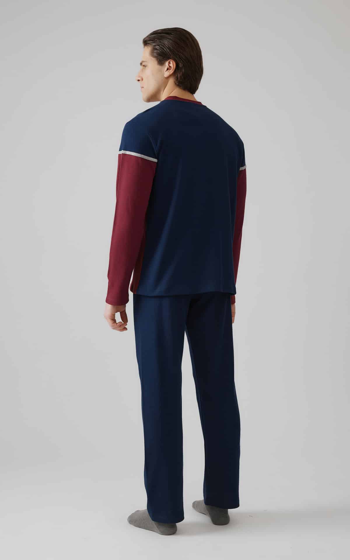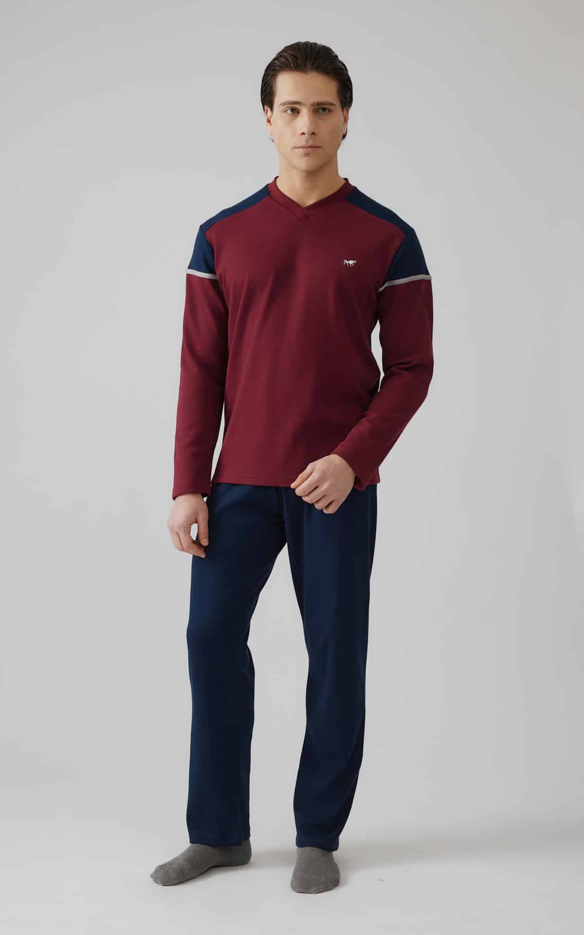 Χειμερινή πυζάμα, ζεστή, από 90% βαμβάκι και 10% νάιλον. Το σετ περιλαμβάνει μπλούζα με V λαιμόκοψη, κέντημα στο στήθος και παντελόνι ίσιο.