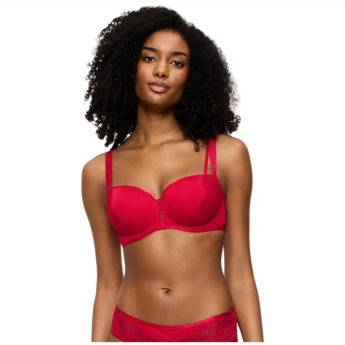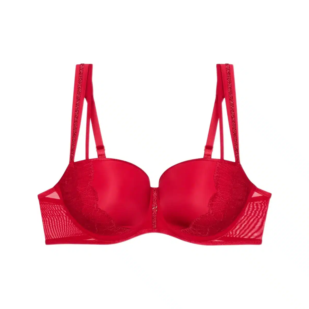 Σουτιέν από την νέα συλλογή της Triumph. Balconette μέτριας κάλυψης με μπανέλα, χωρίς ενίσχυση. Ανακυκλωμένη δαντέλα με ιριδίζον νήμα Lurex για γυαλιστερό εφέ. Αόρατο κάτω από τα ρούχα, αλλά διακοσμημένο για μια πινελιά λάμψης. Ανακυκλωμένη δαντέλα και ύφασμα με πιστοποίηση GRS.